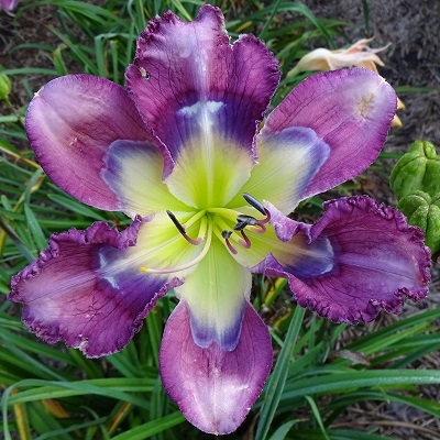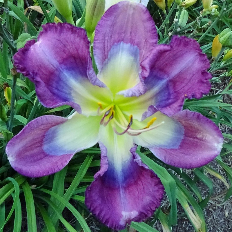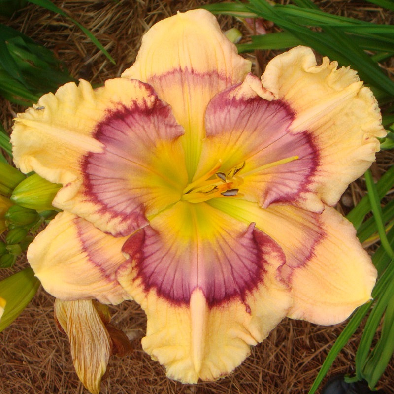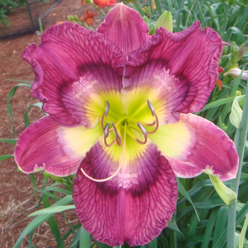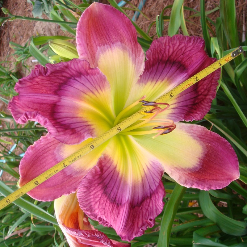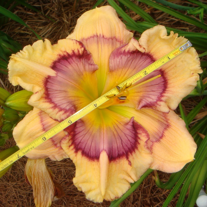 This huge flat flower totally captivates you when you pass by the plant. At times it can have as many as three blooms open at a time on one scape. The scapes are very stocky, and the plant has good wide-angle branching. The flowers are carried well apart from each other. The blooms remain flat during the day and have excellent sun resistance. On a well-grown plant, the bloom size rarely goes below eight inches; in the early part of the bloom season, it is common to see 9 inch blooms on this plant. The pattern of broken dots can disappear into a solid purple ring on the very hottest summer days, but the pattern returns with milder temperatures.
