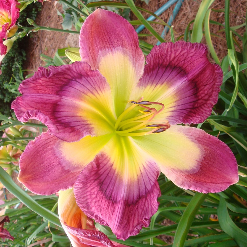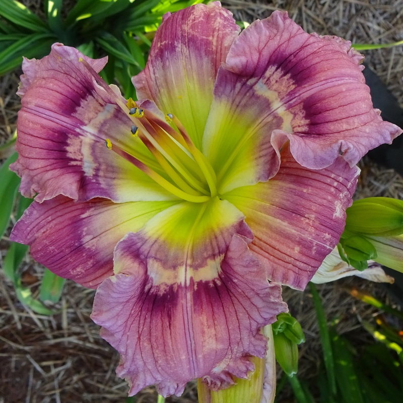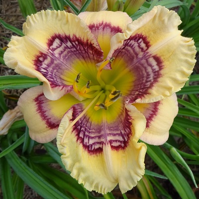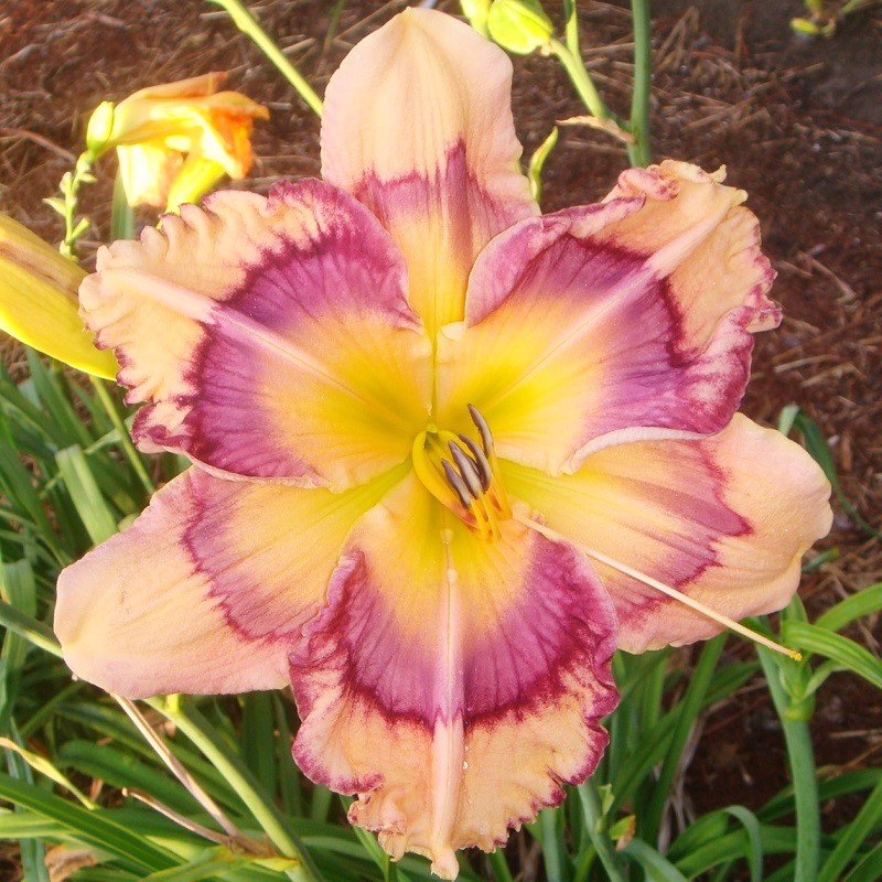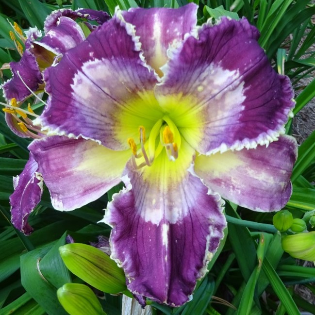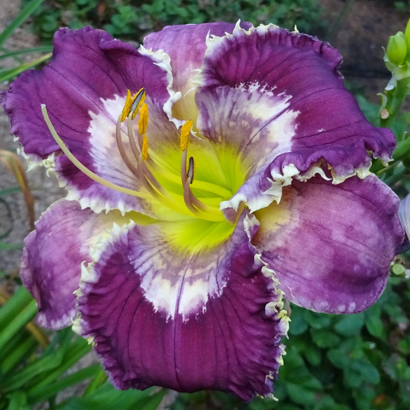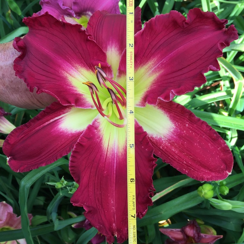 This huge flat flower totally captivates you when you pass by the plant. At times it can have as many as three blooms open at a time on one scape. The scapes are very stocky, and the plant has good wide-angle branching. The flowers are carried well apart from each other. The blooms remain flat during the day and have excellent sun resistance. On a well-grown plant, the bloom size rarely goes below eight inches; in the early part of the bloom season, it is common to see 9 inch blooms on this plant. The pattern of broken dots can disappear into a solid purple ring on the very hottest summer days, but the pattern returns with milder temperatures.