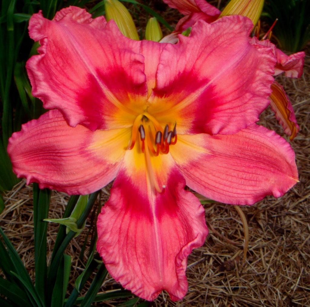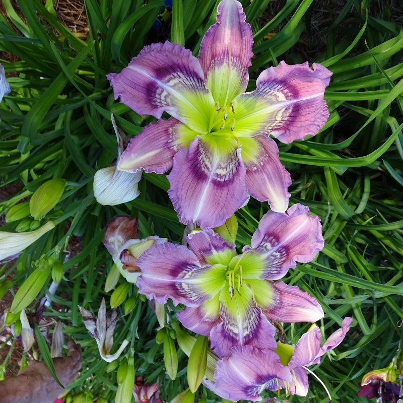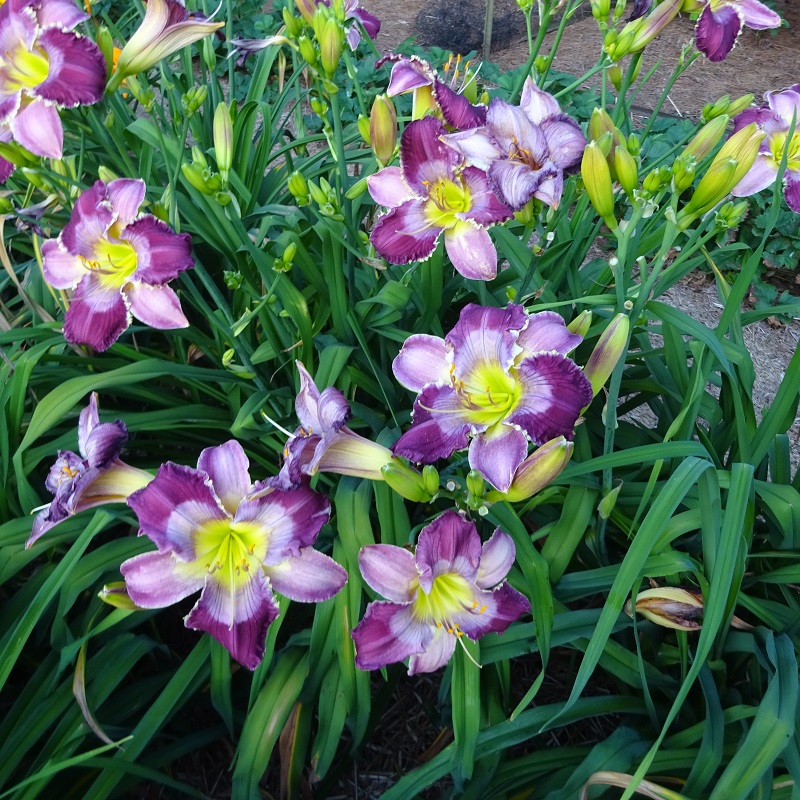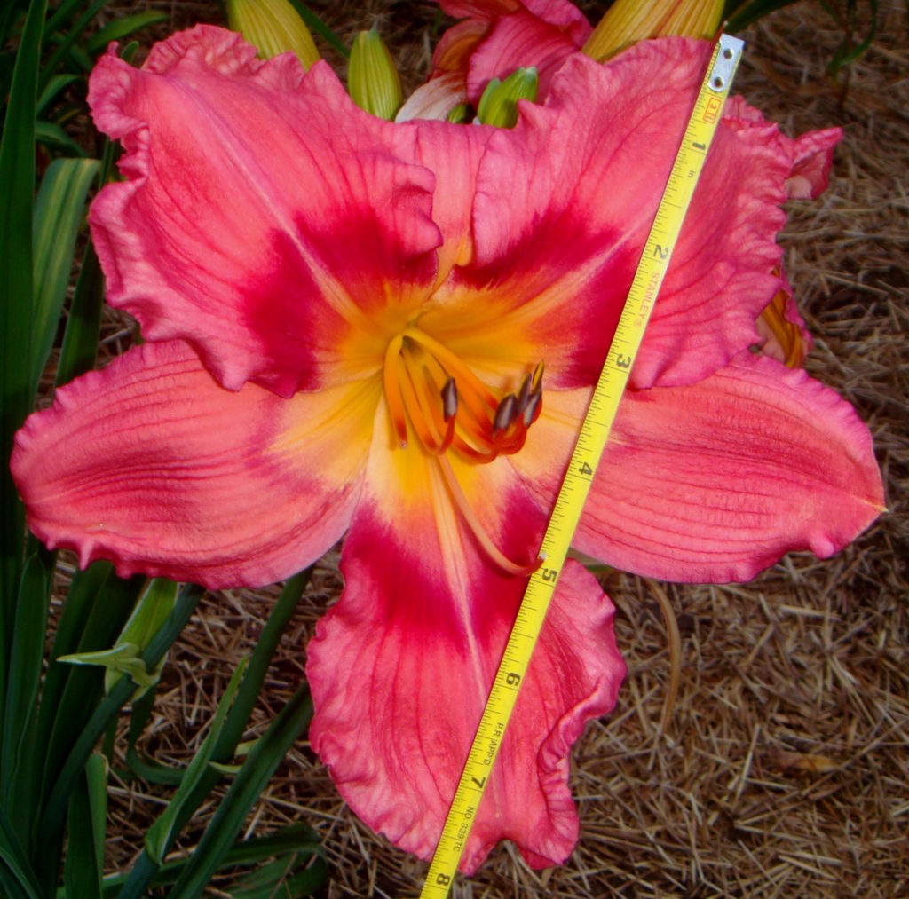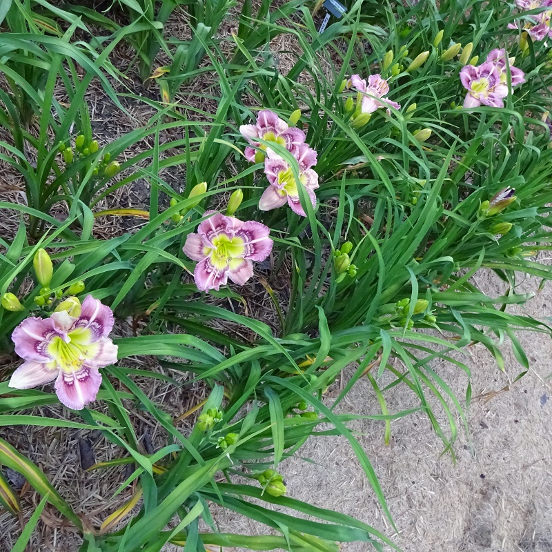 (This flower truly is a “big sucker!”) It was named after the crosswalk guards of my youth that carried large stop signs on full length poles. This is a very tall daylily with a very large bloom; often there are three blooms open at once and it has a big impact in the garden. The flowers are flat, have outstanding sun resistance and good substance. The scapes are strong enough to support a wad of these large blooms, although after a rain, the sheer weight of the wet flowers may cause a little leaning. It is an early morning opener.