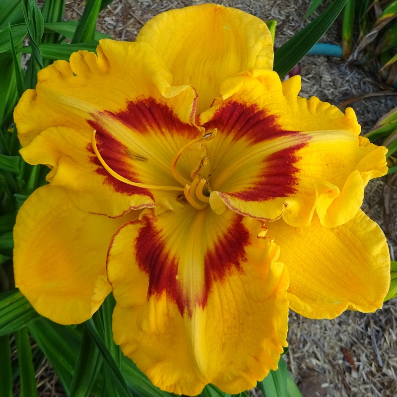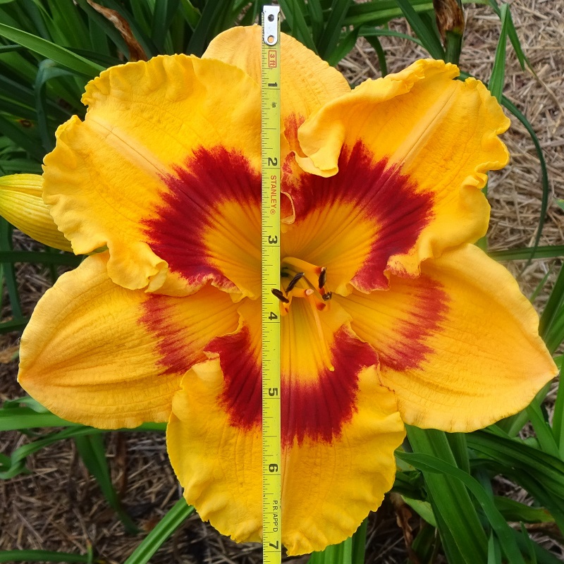 This flower has a color saturation unlike any other cultivar that I have ever grown. The depth of each color is such that it appears to be lit from within. The golden yellow is slightly overlaid with a soft apricot blush. The golden eye finishes as a small green center. The outer eyezone is extremely intense, with several layers of red, orange, and red-orange. Nicely ruffled, with very heavy substance and outstanding sun resistance. It is slightly chaliced on cool mornings. These flowers are presented beautifully on strong scapes well above the foliage with no crowding. Foliage is very strong, vigorous, dark green and stiff. I have never seen any disease or rust on this plant.