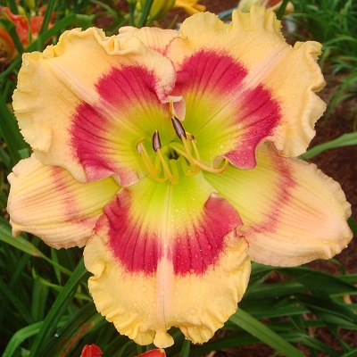 The colors of this beautifully formed, heavy substanced flower makes you want to pick it and take a bite! Sitting atop strong scapes, the large flowers are carried above the foliage and have outstanding sun resistance. The bloom shows little or no fading even in the hottest weather. It has excellent foliage with high rust resistance, and it is easy pod and pollen fertile.