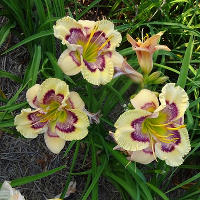 This has been a truly lovely flower to see each year. It has tall scapes with wide angle branching which provide a wonderful framework for display of these lovely creamy white flowers with blue and purple eyezones. The flowers are EMO, and open flat and hold flat all day. The flowers have excellent substance and good sun resistance; the base color does vary according to temperature, showing a deeper cream color in cool temperatures and a lighter cream color in the heat of summer. The eye color, in shades of deep blue and purple, remains consistent throughout the bloom season. The flowers have an open look to them, you never see any crowding. Pod and pollen fertile; foliage is medium green, and has been shown to have good rust reistance with arching form. It has moderate increase. ($135.00 d.f.)