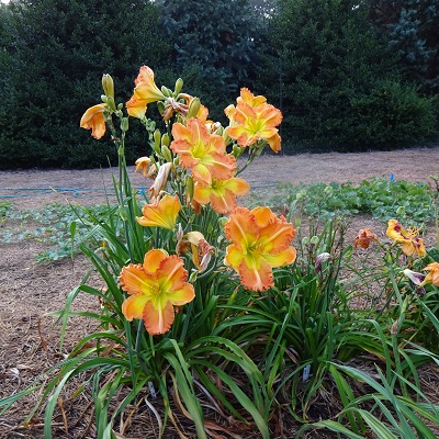 In walking through the garden, no one will miss this outstanding performing daylily. Everything about it appears to be on steroids. It is a completely different flower from anything else I have developed over the years. It starts the season with 9-inch flowers and continues to bloom for a considerably long period with 8-inch flowers facing out for everyone to see. These flowers with glowing color and heavy substance are distributed on 4-foot scapes and tower above everything else in my garden. It is resistant to damage from rain and sun; the foliage remains healthy for most of the season. It does get some rust on the older leaves as the plant is starting to go dormant. I give it a moderate rust resistance rating. It is pod and pollen fertile, although it does produce some air pods. I don’t keep track of my crosses, but I suspect that this plant has Malibu Sunset as a parent on one side. You would never think that this is a diploid, given the size of the plant and even the size of the roots. The scapes are extremely robust and strong and remain straight and upright throughout the season, despite heavy blooms and a load of pods. It continues to be one of my favorite daylilies in the garden. ($135.00 d.f.)